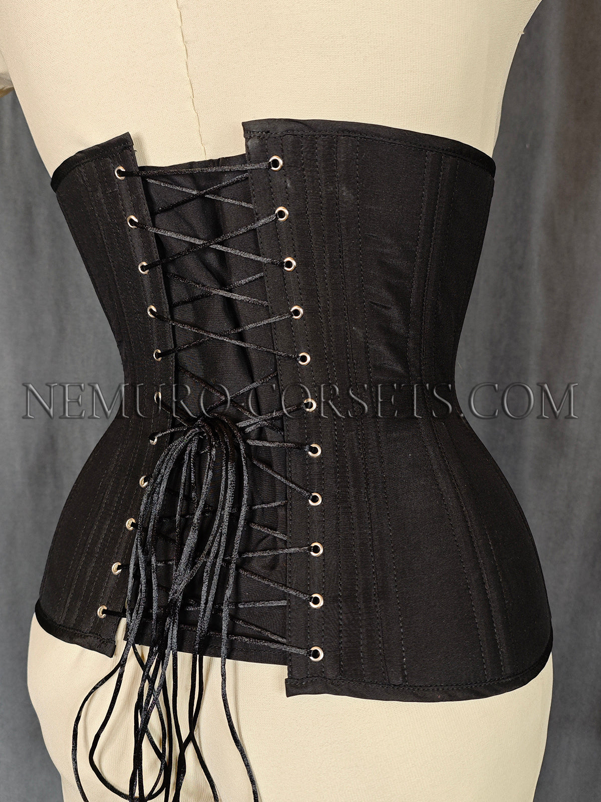 Ready to ship underbust corset in black silk. Steel busk closure, back lacing.